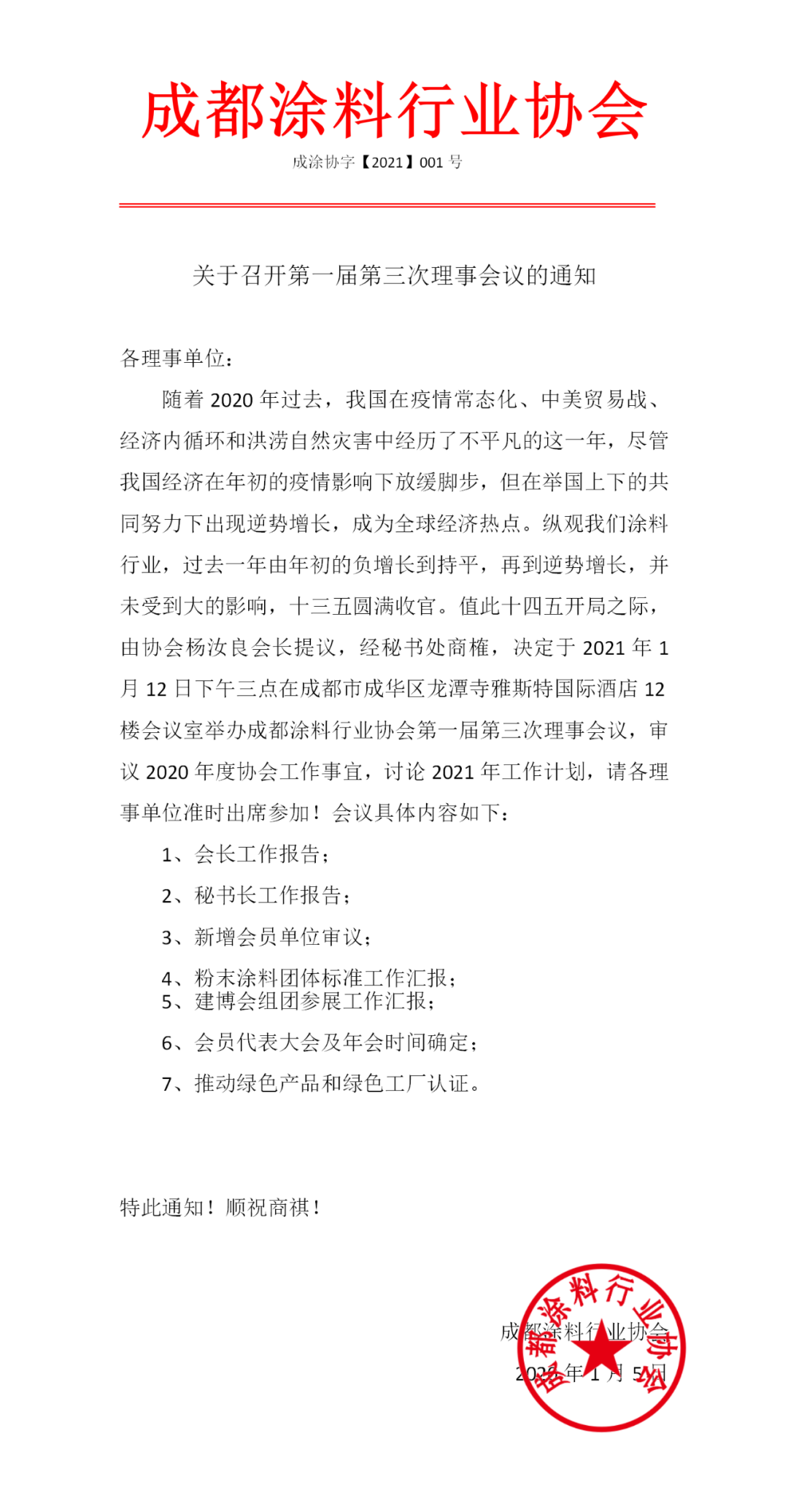 随着2020年过去,我国在疫情常态化、中美贸易战、经济内循环和洪涝自然灾害中经历了不平凡的这一年,尽管我国经济在年初的疫情影响下放缓脚步,但在举国上下的共同努力下出现逆势增长,成为全球经济热点。纵观我们涂料行业,过去一年由年初的负增长到持平,再到逆势增长,并未受到大的影响,十三五圆满收官。值此十四五开局之际,由协会杨汝良会长提议,经秘书处商榷,决定于2021年1月12日下午三点在成都市成华区龙潭寺雅斯特国际酒店12楼会议室举办成都涂料行业协会第一届第三次理事会议,审议2020年度协会工作事宜,讨论2021年工作计划,请各理事单位准时出席参加!会议具体内容如下: