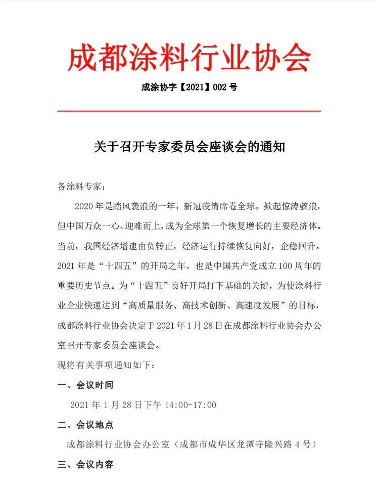2020年是踏风袭浪的一年,新冠疫情席卷全球,掀起惊涛骇浪,但中国万众一心、迎难而上,成为全球第一个恢复增长的主要经济体。当前,我国经济增速由负转正,经济运行持续恢复向好,企稳回升。2021年是“十四五”的开局之年,也是中国共产党成立100周年的重要历史节点。为“十四五”良好开局打下基础的关键,为使涂料行业企业快速达到“高质量服务、高技术创新、高速度发展”的目标,成都涂料行业协会决定于2021年1月28日在成都涂料行业协会办公室召开专家委员会座谈会。